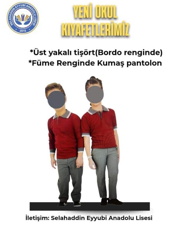 Sayın Velilerimiz, Sevgili Öğrencilerimiz,Selahaddin Eyyubi Anadolu Lisesi 2025-2026 Eğitim-Öğretim yılından itibaren 9. sınıf öğrencilerimizden başlamak üzere yeni okul kıyafetimiz yukarıdaki fotoğraflarda olduğu gibidir.