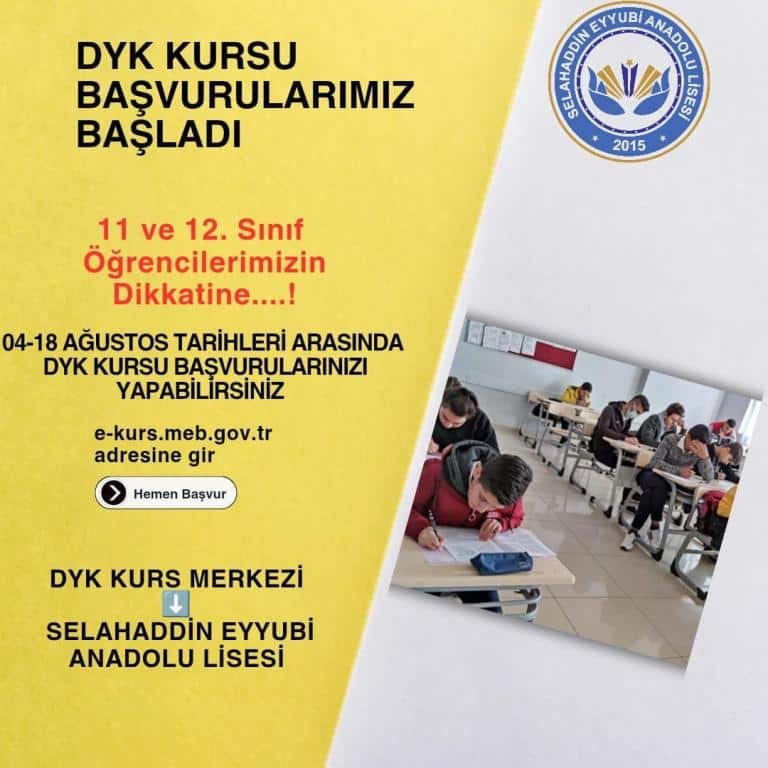 Haftasonu DYK(Destekleme ve Yetiştirme Kursları) kurslarımız başlıyor.11 ve 12.sınıf öğrencilerimiz e-kurs.meb.gov.tr adresine girerek ders seçiminde bulunabileceklerdir.